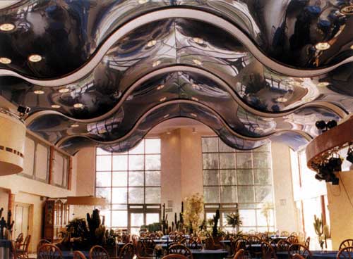 А затем, стилизуя интерьеры под определенные исторические эпохи, потолок действительно начинают расписывать, и роспись эта по тонкости исполнения и цветовой гармонии не уступает фрескам. Так, интерьеры в стиле современного модерна украшены расписными плафонами потолков, утопленными вглубь в виде овала или очерченными лепниной. А в создании интерьеров в современном стиле, стиле хай-тек многоуровневый потолок может имитировать, например, купол звездного неба с парящими в центре большого и прозрачного овала яркими звездами-лампочками. Такое оформление потолка придает интерьеру загадочность и некую таинственность. Стиль, воспроизводящий обстановку домов английских аристократов может использовать деревянную обшивку потолка геометрически сложной формы. Здесь цвет дубовых панелей стен гармонирует с благородным цветом древесины потолка, при этом не принижая, а наоборот, за счет сложной формы, как бы поднимая его.
